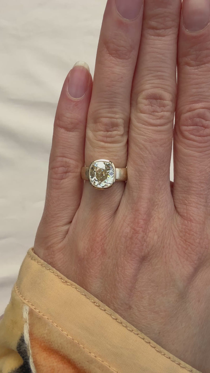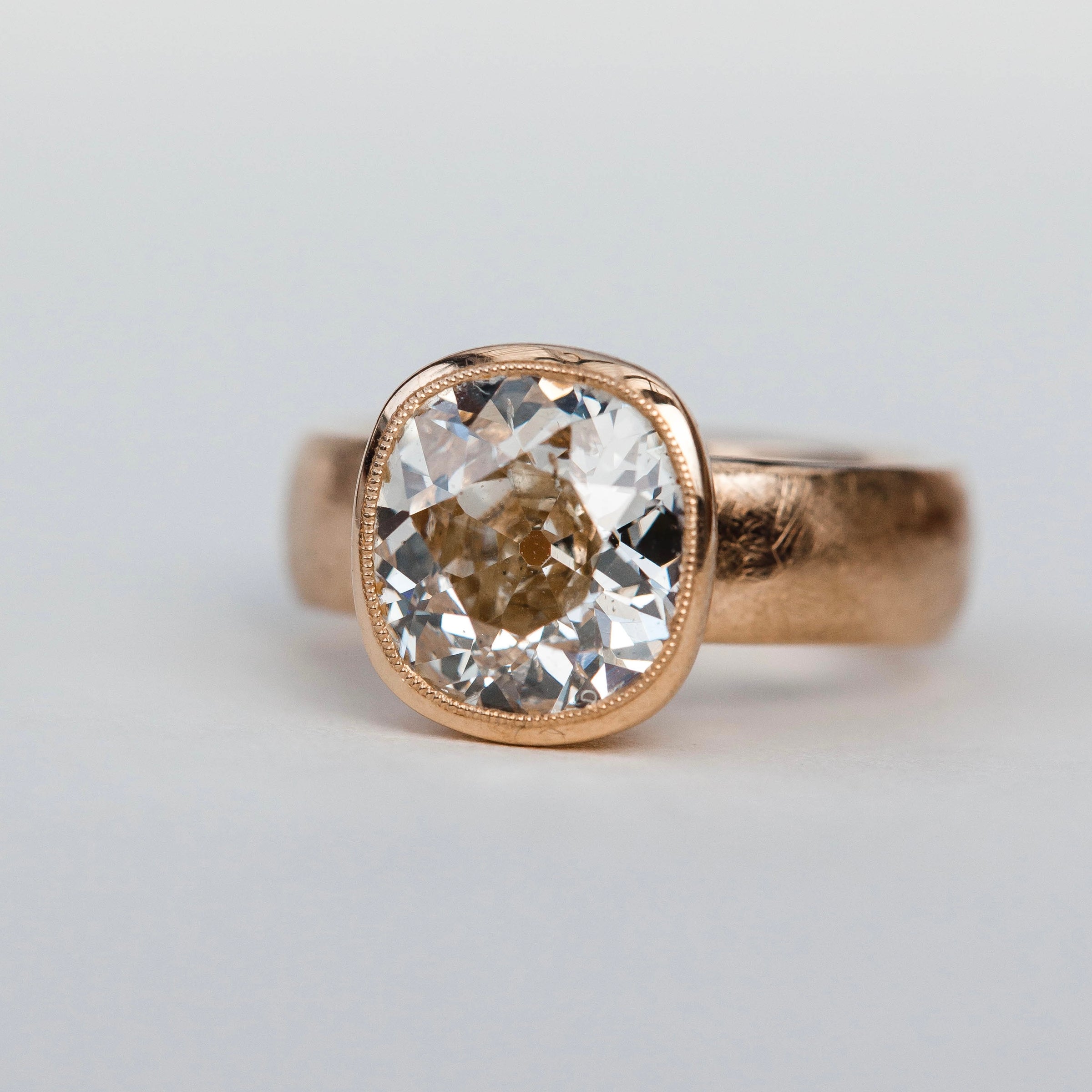 Timeless romance. This antique Old Mine Cut natural diamond is bezel set in 14k recycled yellow gold with vintage design details.