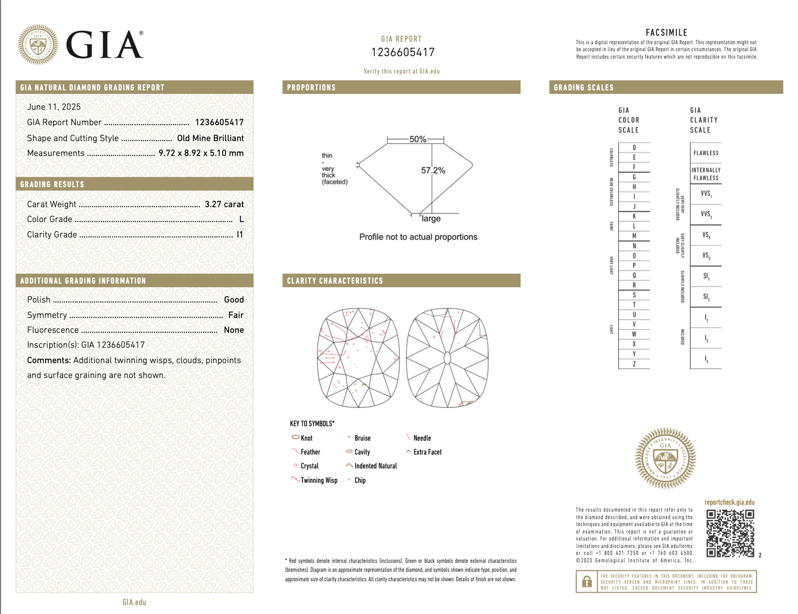Diamond details - antique natural GIA certified Old Mine Cut diamond, 3.27ct, L color, I1 clarity. GIA certificate 1236605417