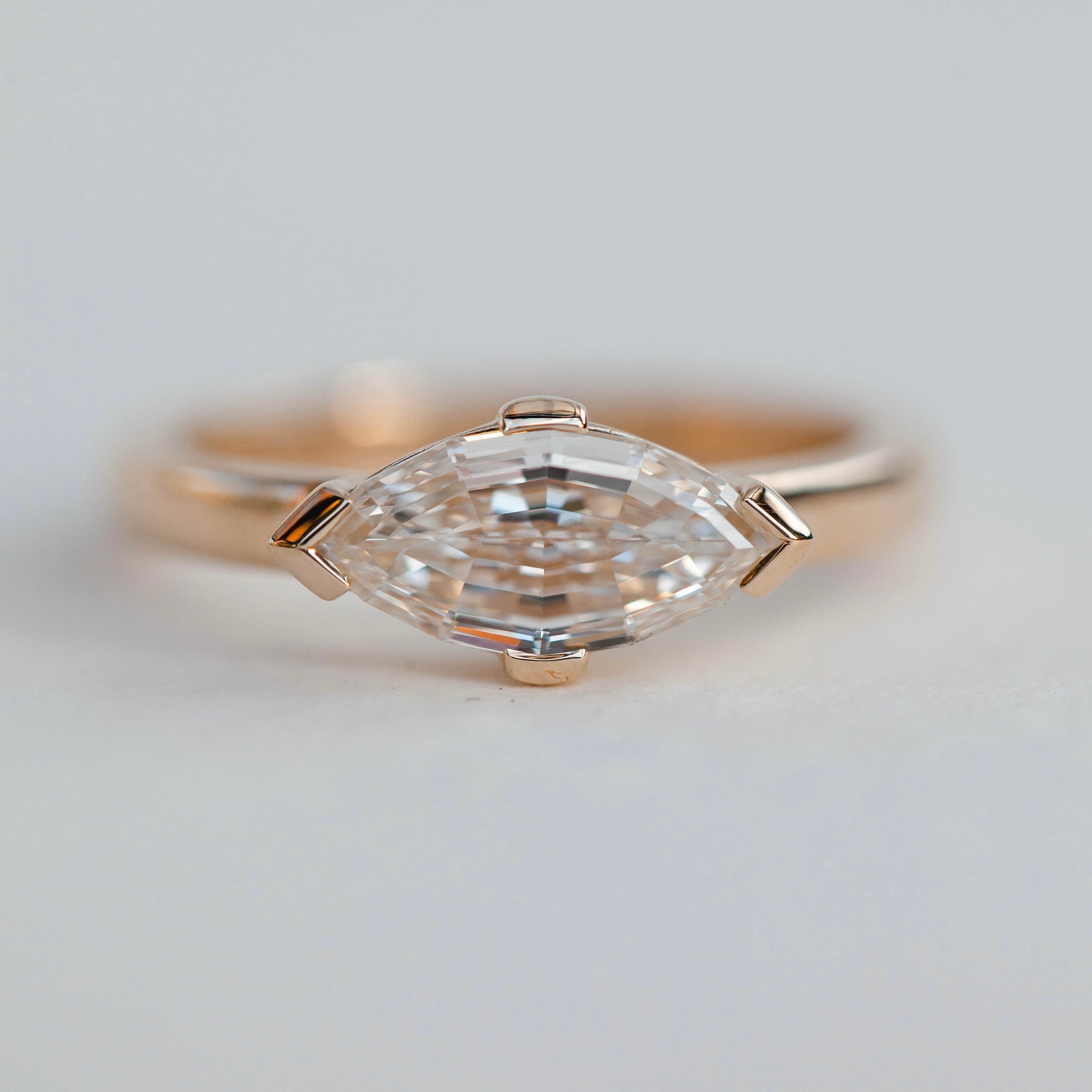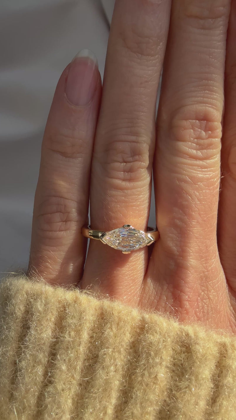 Modern in all the right ways. 1.55 carat lab grown step cut marquise diamond is set in 14k recycled yellow gold. This East West partial bezel setting is as stunning as it is easy to wear.